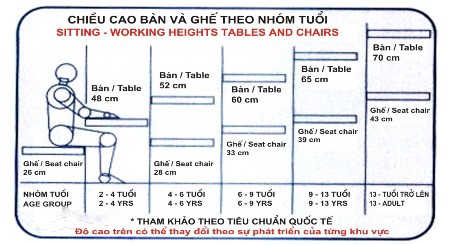 -     Kích thước bàn làm việc chuẩn phù hợp với từng lứa tuổi học sinh